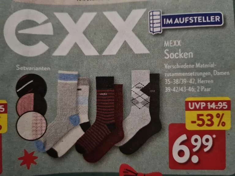 Stil 2 Socke A: 56 % Polyester, 18 % Baumwolle, 14 % regenerierte Wolle, 7 % Acryl, 2 % Viskose, 2 % Polyamid, 1 % Elasthan