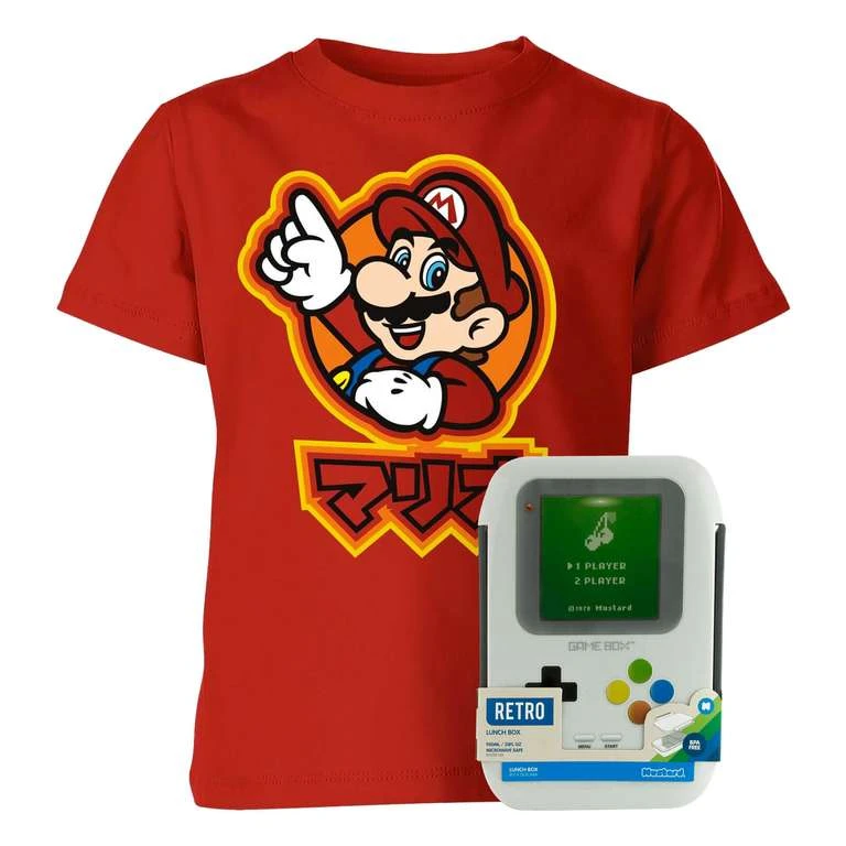 Es besteht auch einem Mario Shirt in Rot und einer Brotdose im Nintendo Look.